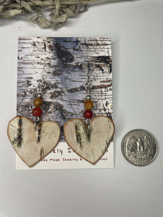 Birchbark Heart Earrings with Carnelian and Fossil Jasper