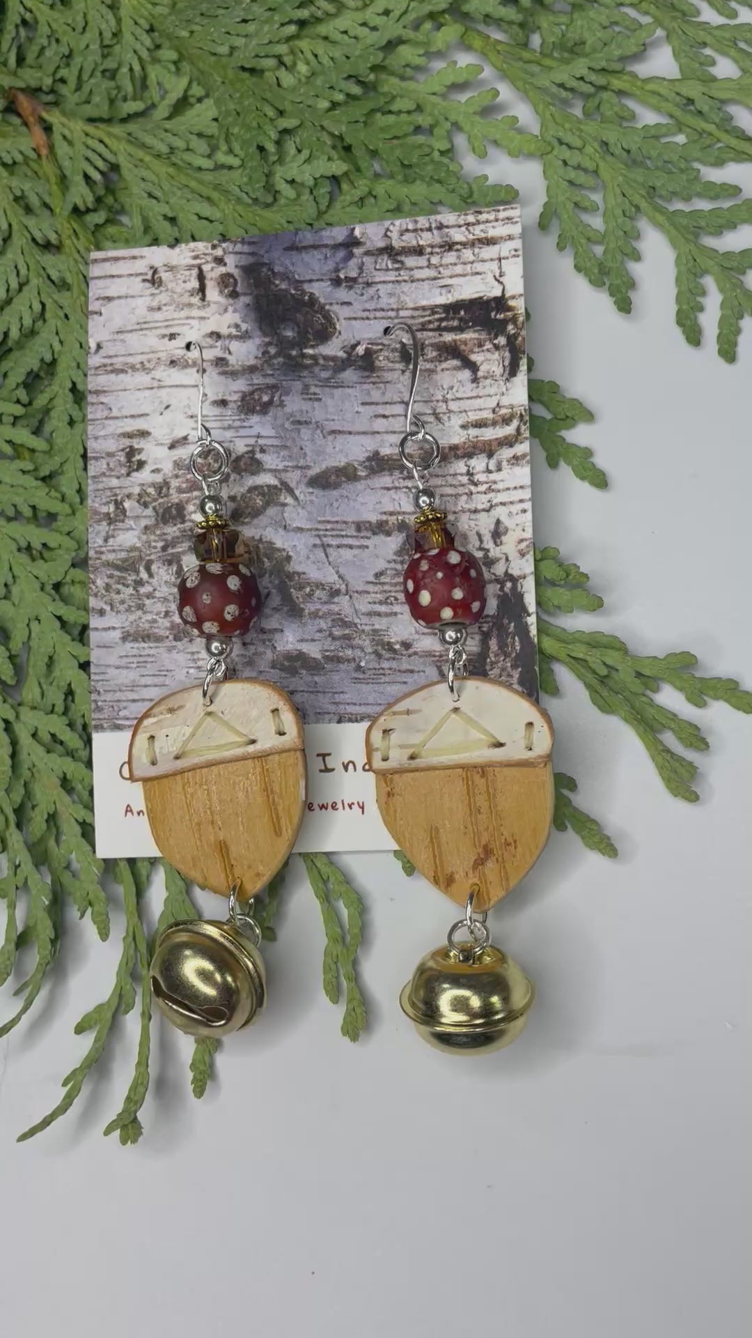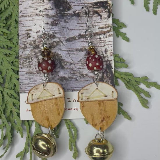 Native American Ojibwe made. Real, natural birchbark indigenously harvest using respectful, traditional and cultural techniques past down generations as to not hurt the birch tree. Hand cut and sewn with sinew. Venetian red skunk trade beads, hawk bells, and glass. Nickel free hooks. Decorative logo gift packaging.