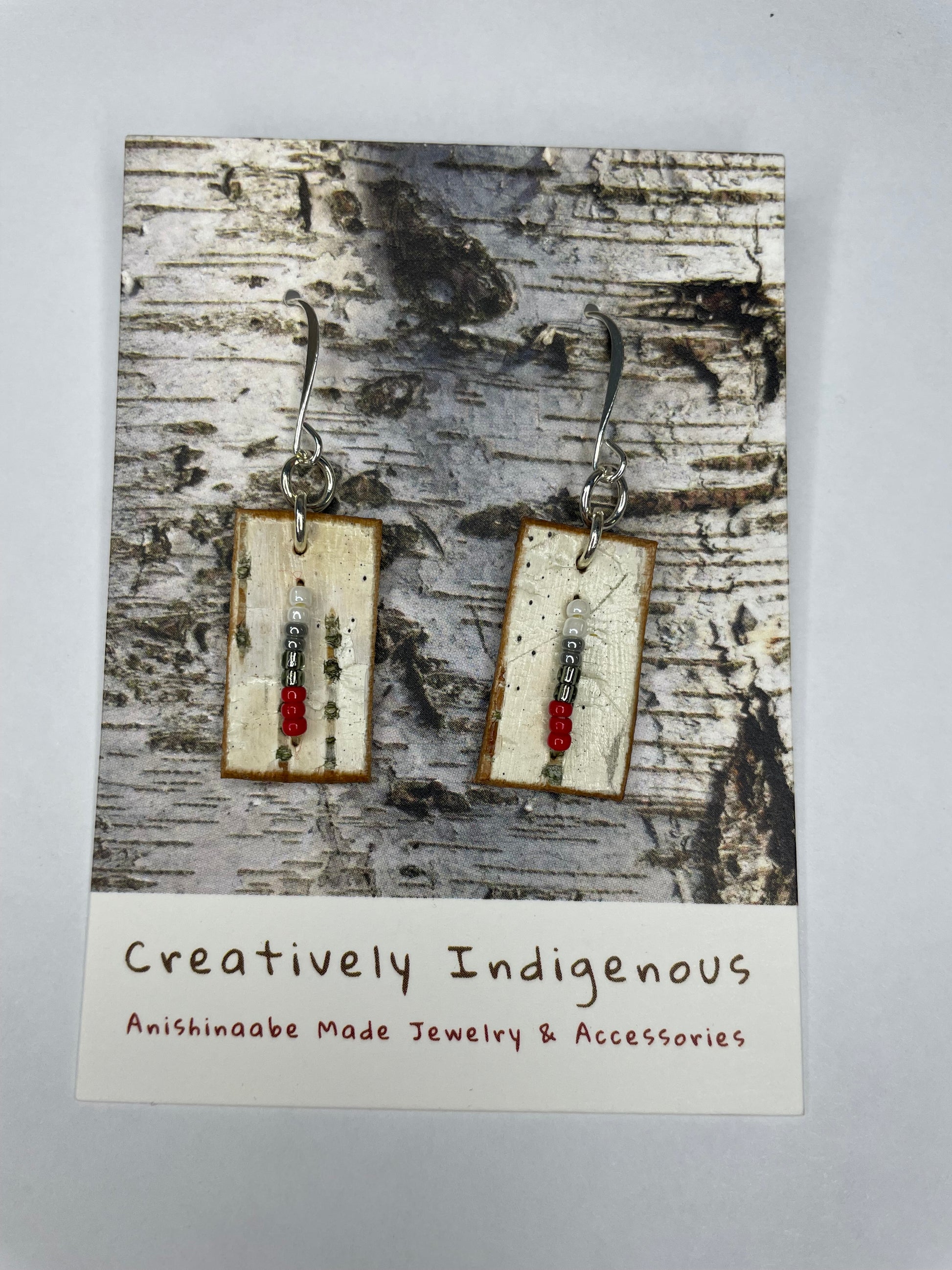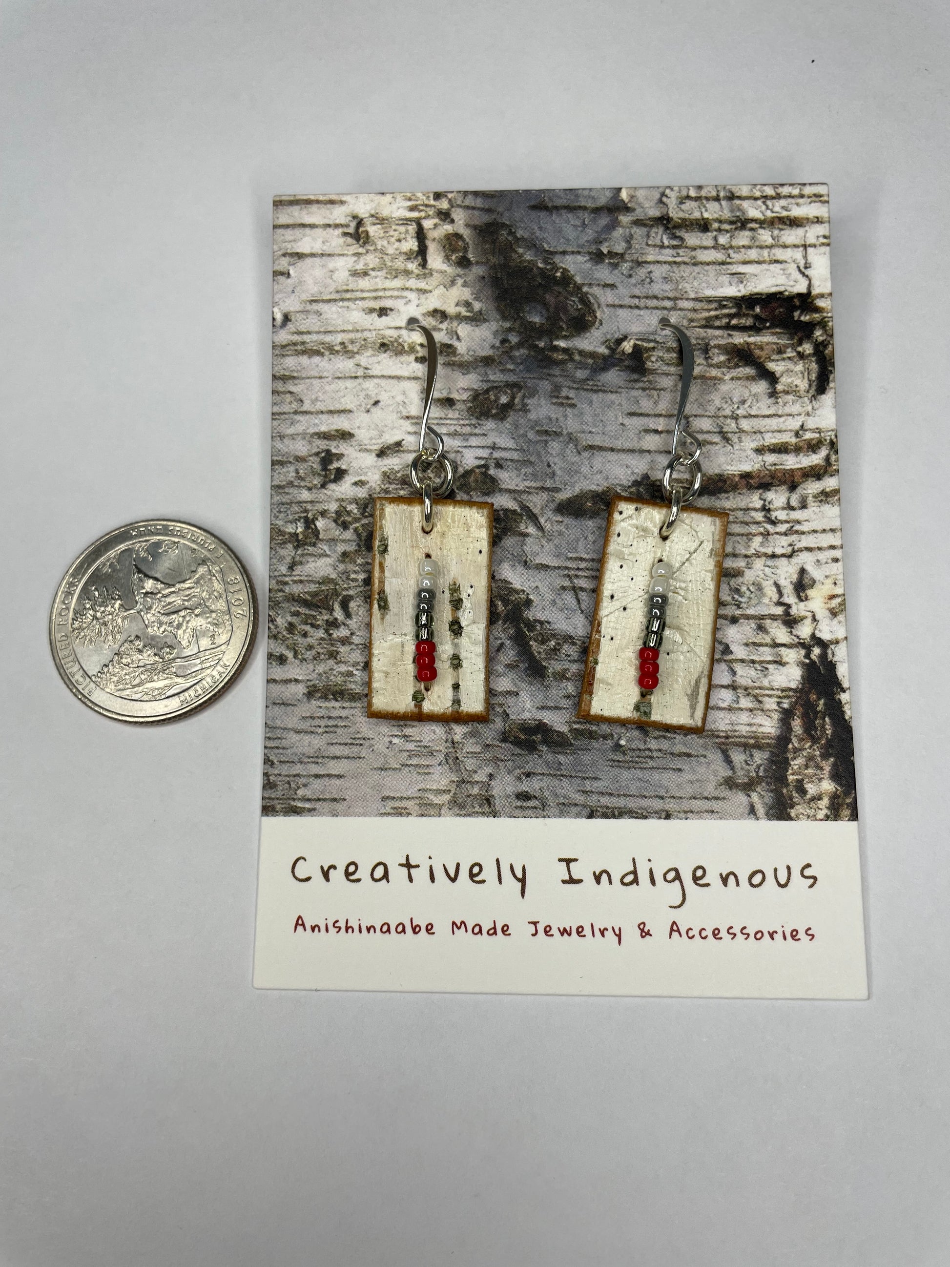 Native American Ojibwe made. Real, natural birchbark indigenously harvest using respectful, traditional and cultural techniques past down generations as to not hurt the birch tree. Hand cut. Nickel free hooks. Size 11 beads. Decorative logo gift packaging.