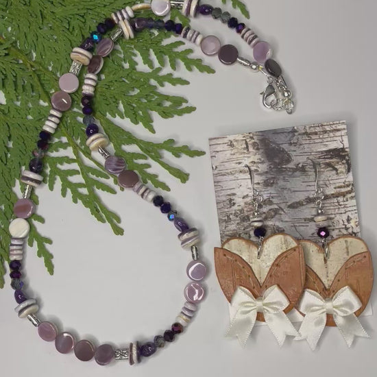 Native American Ojibwe hand made birchbark earring and necklace set. Beautiful premium, sturdy natural bark. Hand cut indigenous florals. Lots of wampum and amethyst on this set with glass crystals. Decorative logo gift packaged.