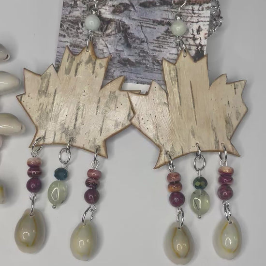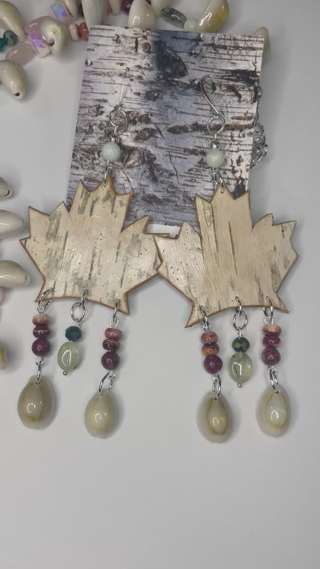 Native American Ojibwe hand made birchbark earring and necklace set. Beautiful premium, sturdy natural bark. Hand cut indigenous florals. Rose quartz, hemimorphitr, prehaite, cowrie, Czech glass, and glass crystal. 23 inch necklace length. 4.5 inch earrings. Decorative logo gift packaged.