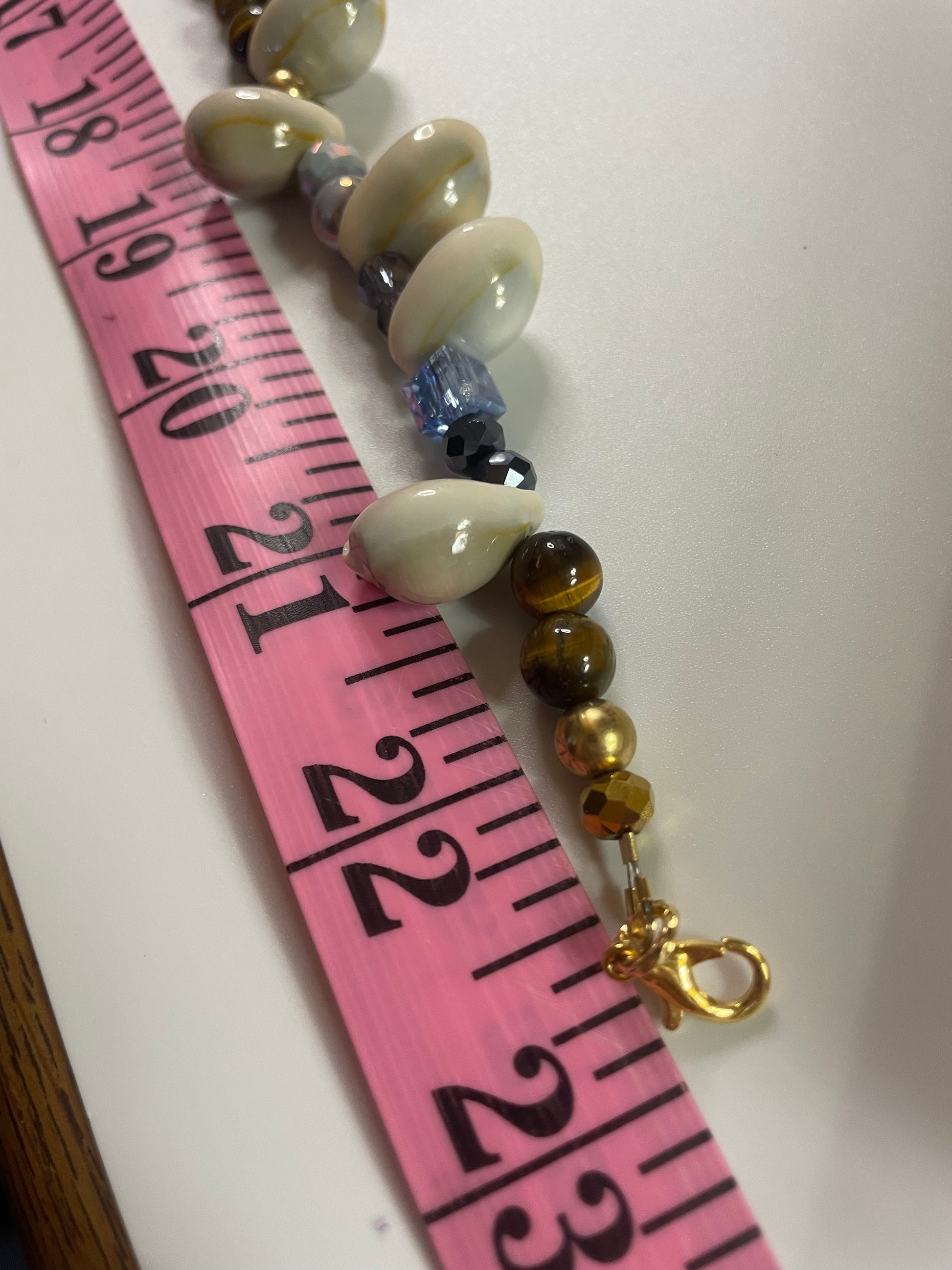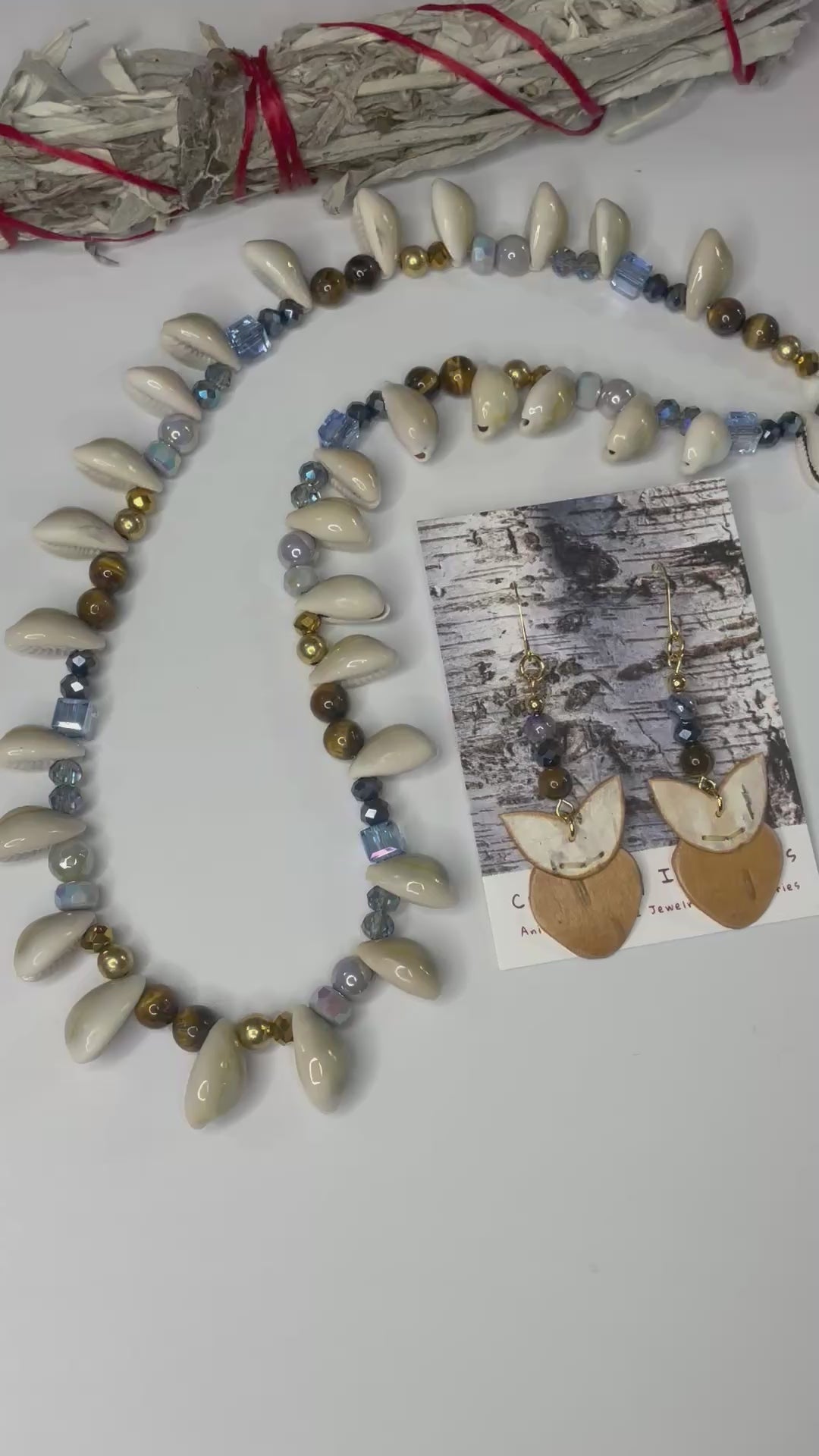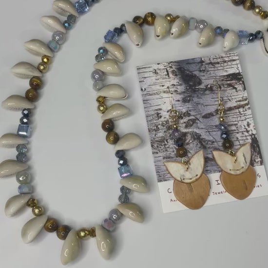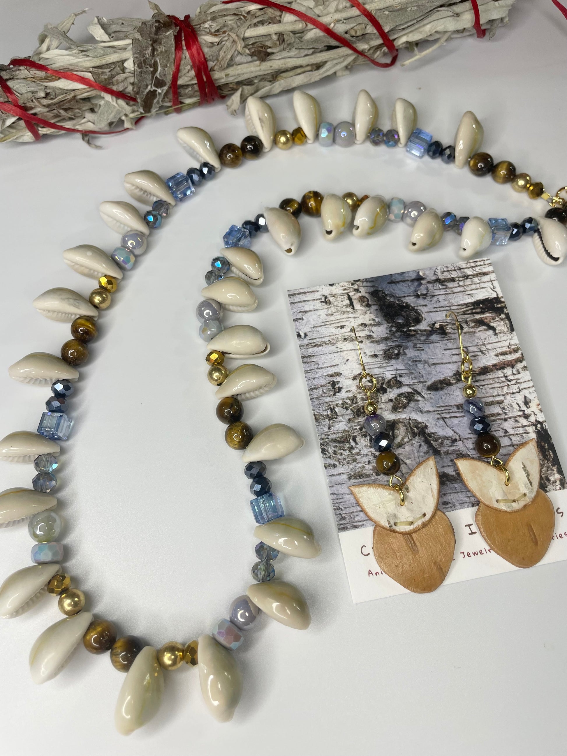 Native American Ojibwe hand made birchbark earring and necklace set. Beautiful premium, sturdy natural bark. Hand cut indigenous florals. Tigers eye, cowrie, Czech glass, and glass crystal. Decorative logo gift packaged.