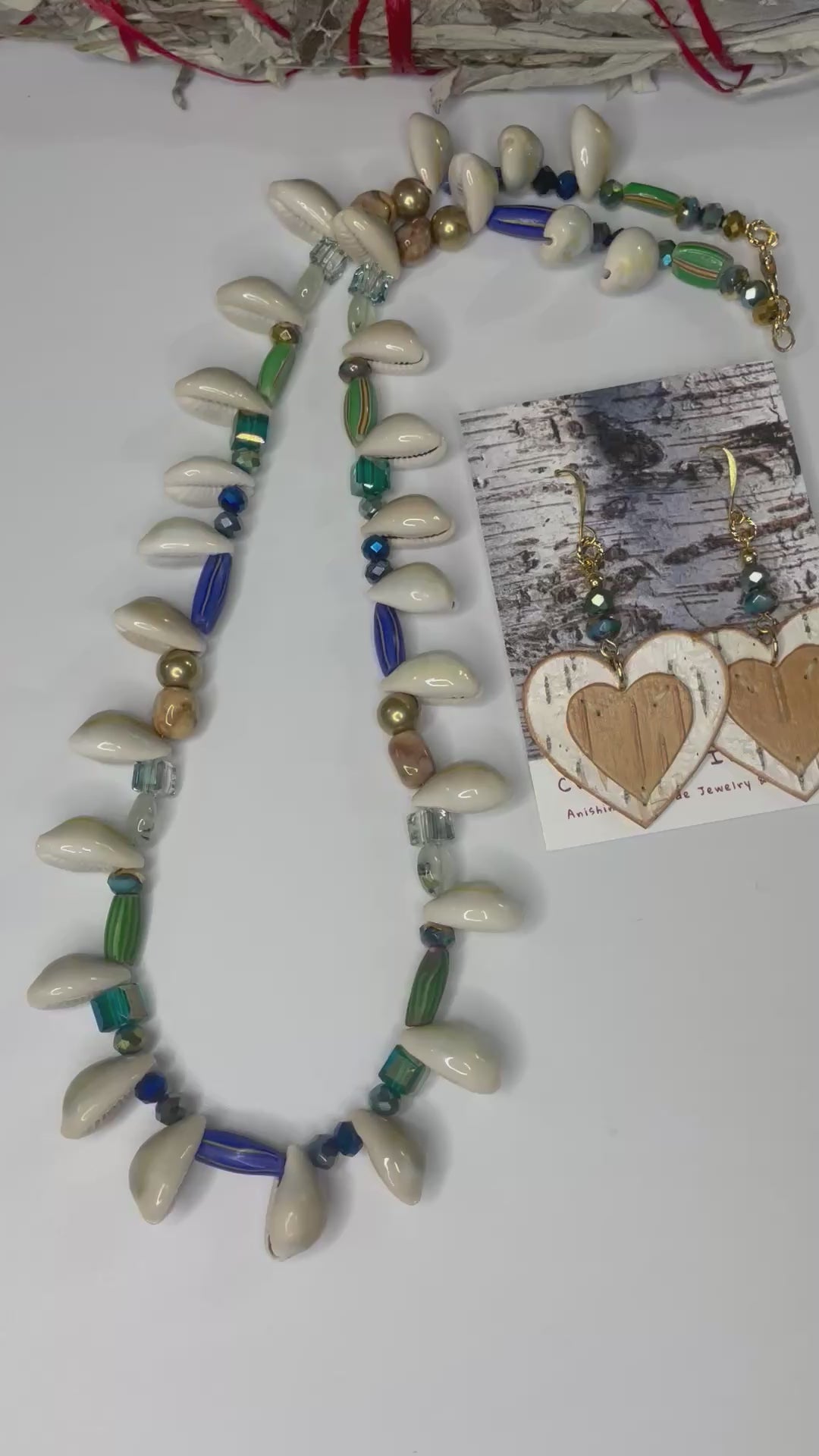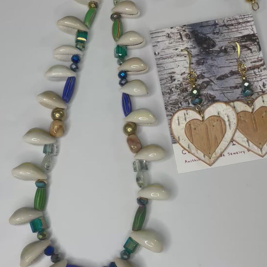 Native American Ojibwe hand made birchbark earring and necklace set. Beautiful premium, sturdy natural bark. Hand cut indigenous florals. Venetian trade beads, prehnite, jasper, cowrie, Czech glass, and glass crystal. Decorative logo gift packaged.