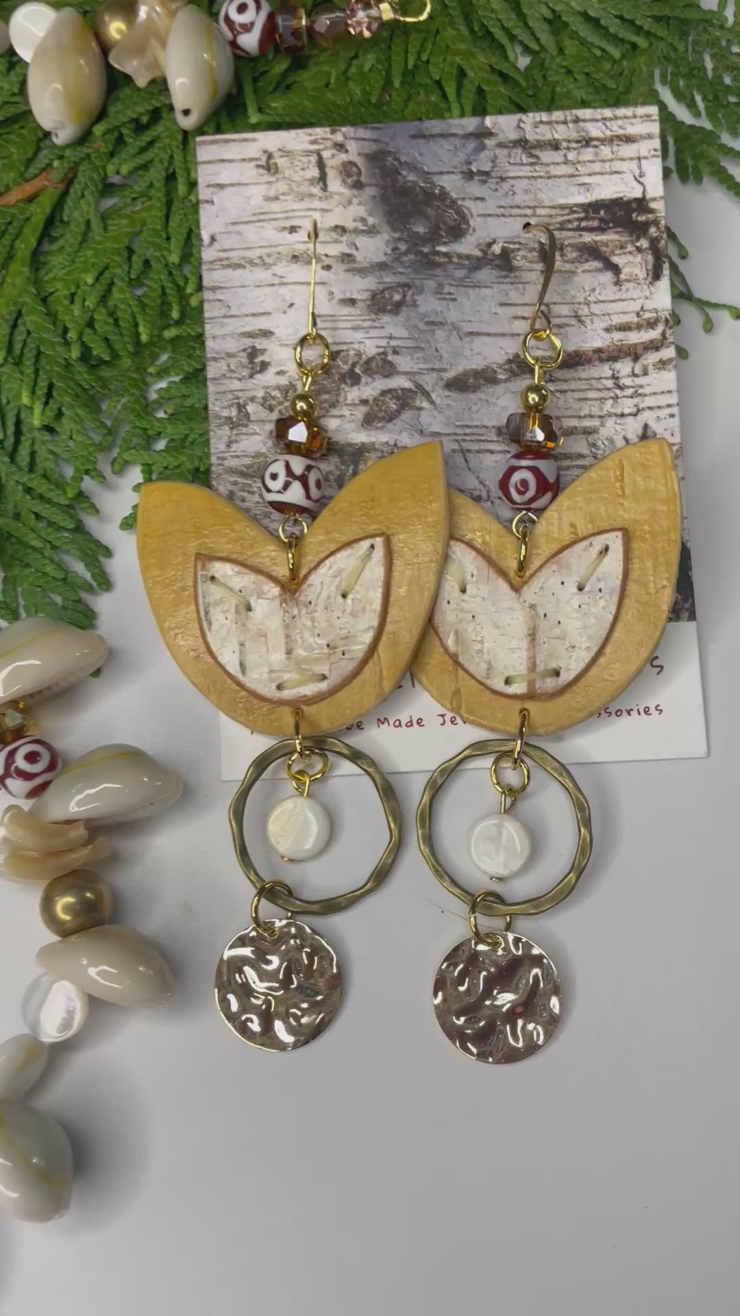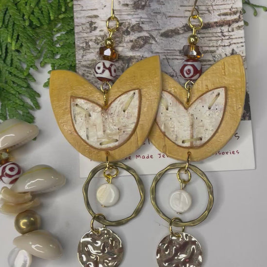 Native American Ojibwe hand made birchbark earring and necklace set. Beautiful premium, sturdy natural bark. Hand cut indigenous florals. Shell, tiger’s eye. Yellow gold metals and hues. DZI, Czech glass, cowrie shell, and glass crystal. Decorative logo gift packaged.