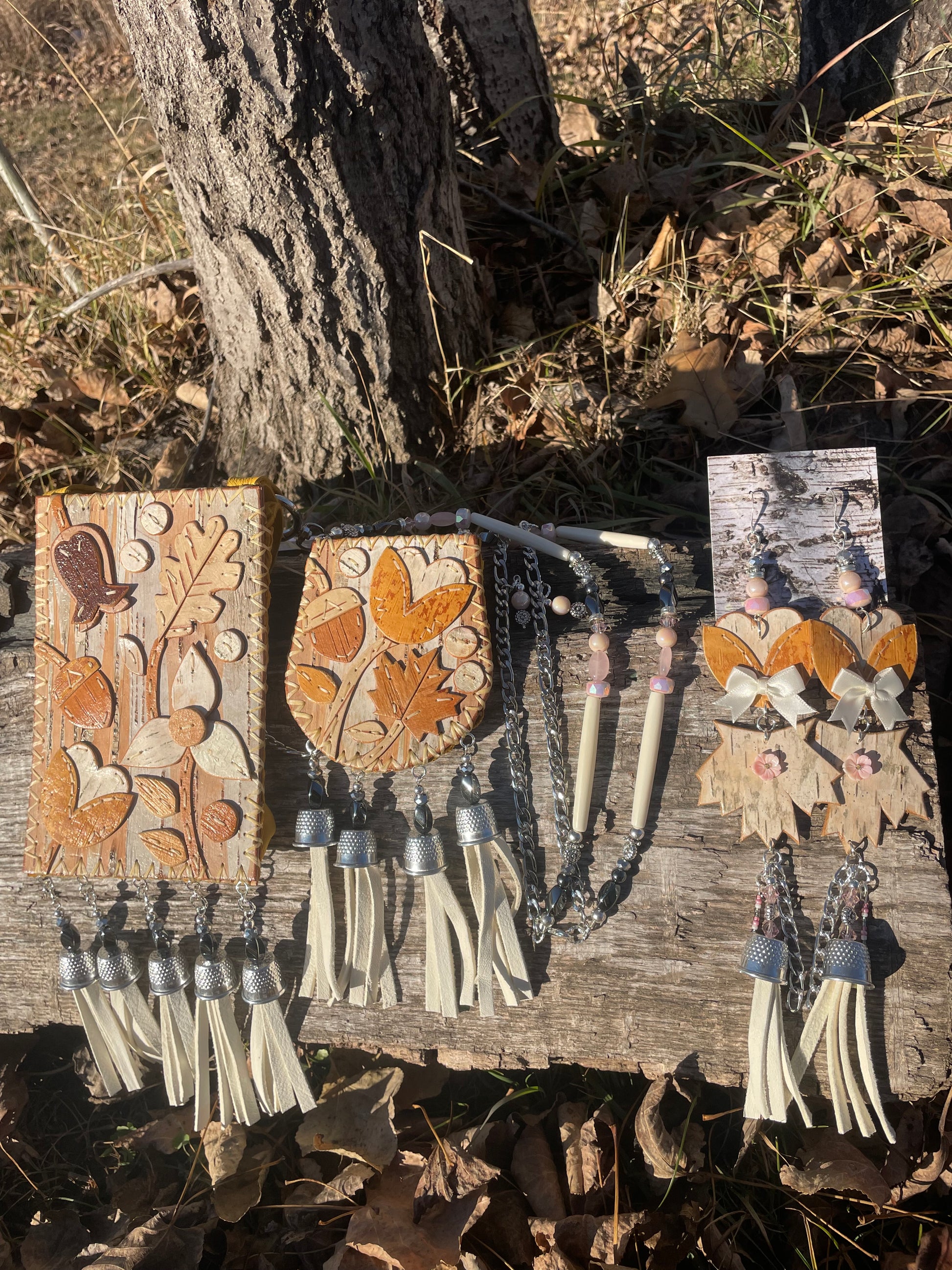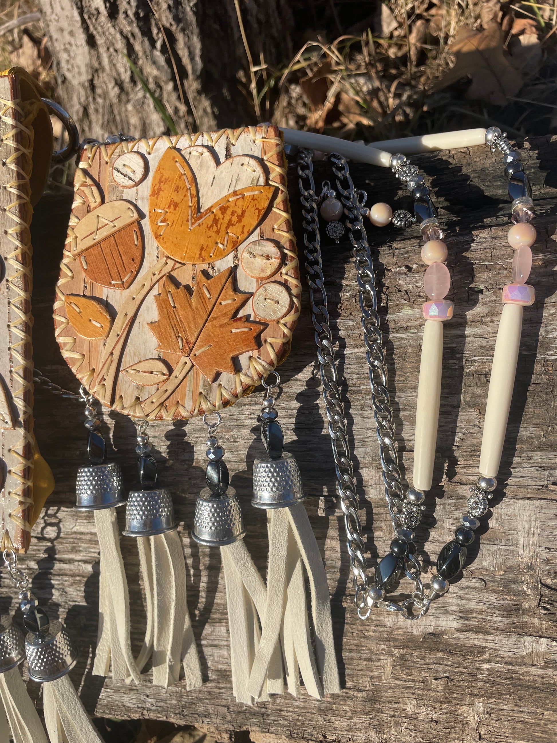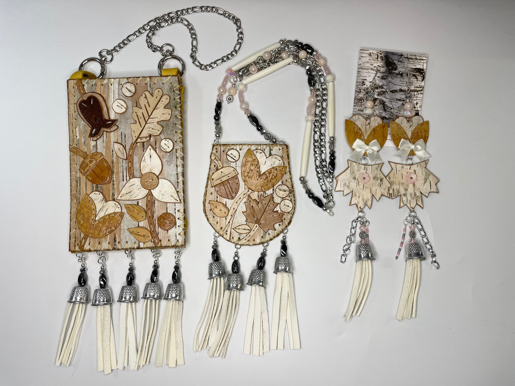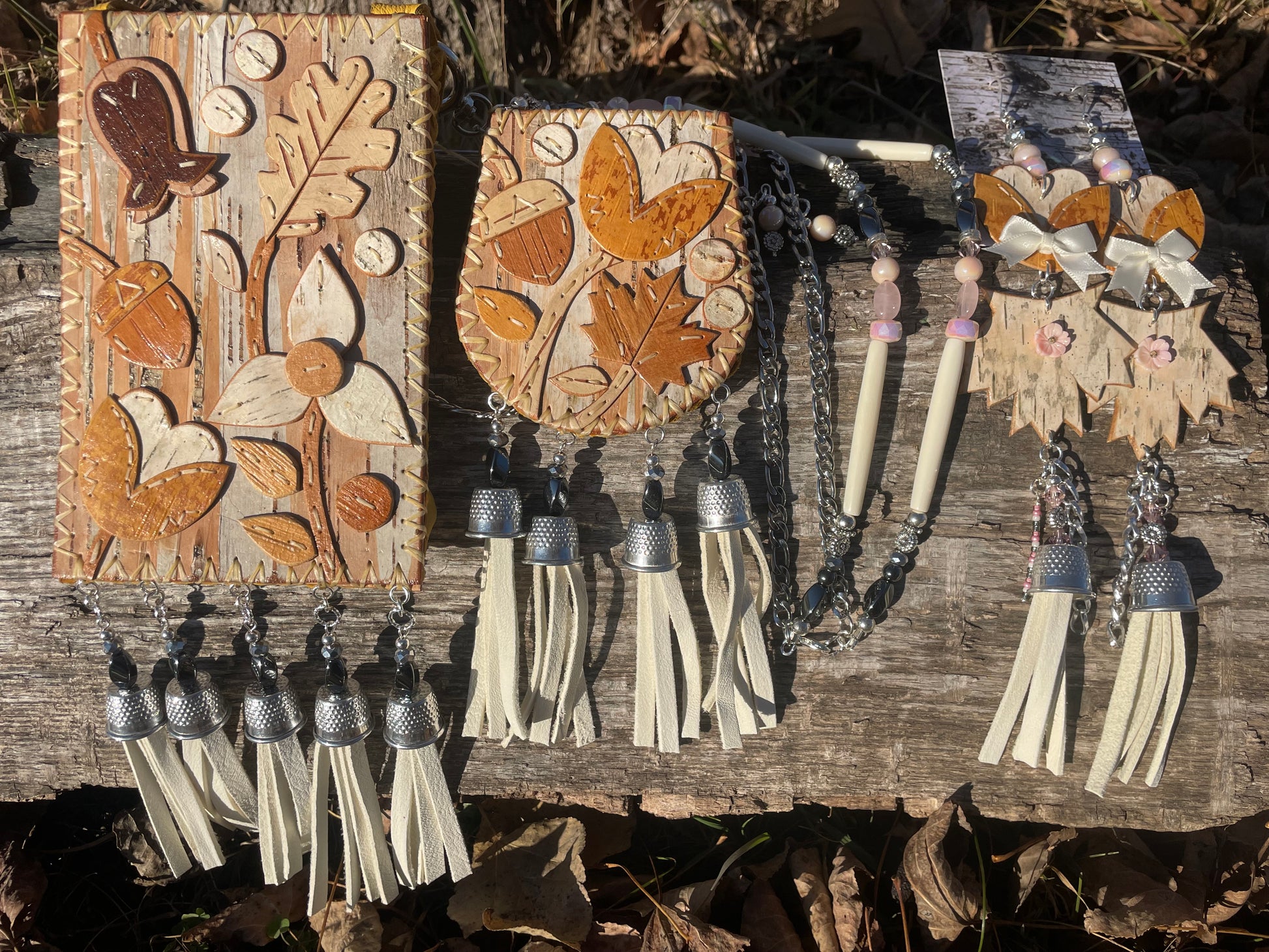 Medallion necklace, small purse, and earring set. Native American Ojibwe hand made. Beautiful premium, sturdy natural bark. Hand cut indigenous florals of the Great Lakes region. Hematite, rose quartz, glass crystal, polished buffalo bone. Grandmother thimbles. Commercial chain findings. Decorative logo gift packaged.