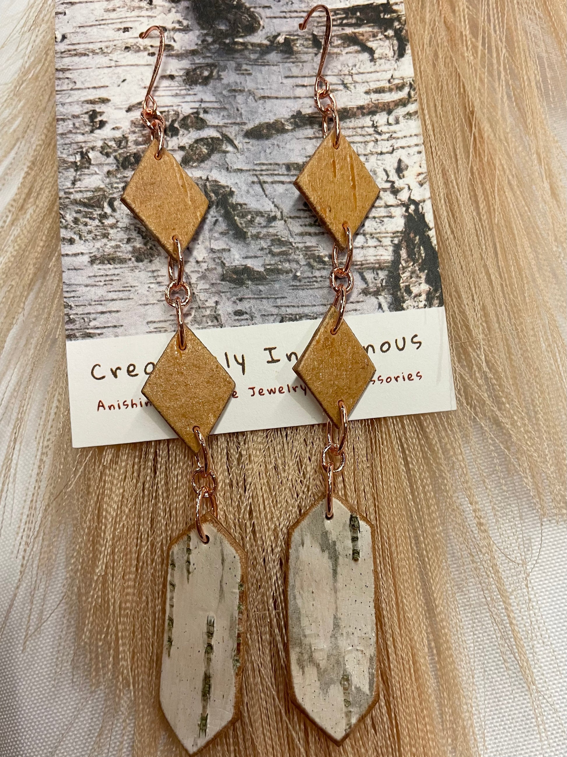 Native American Ojibwe made. Real, natural birchbark indigenously harvest using respectful, traditional and cultural techniques past down generations as to not hurt the birch tree. Hand cut natural birchbark. Nickelfree hooks. Comes in decorative logo gift packaging.