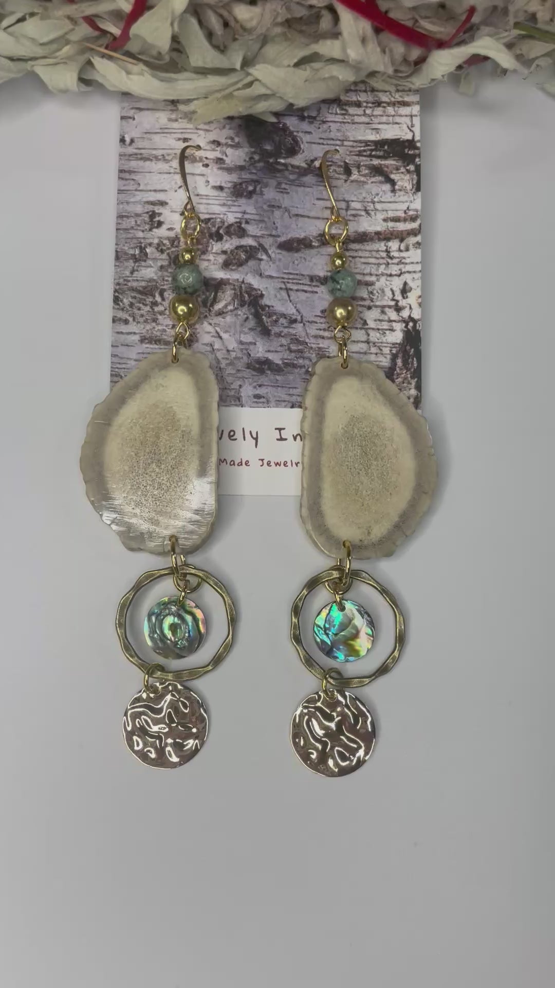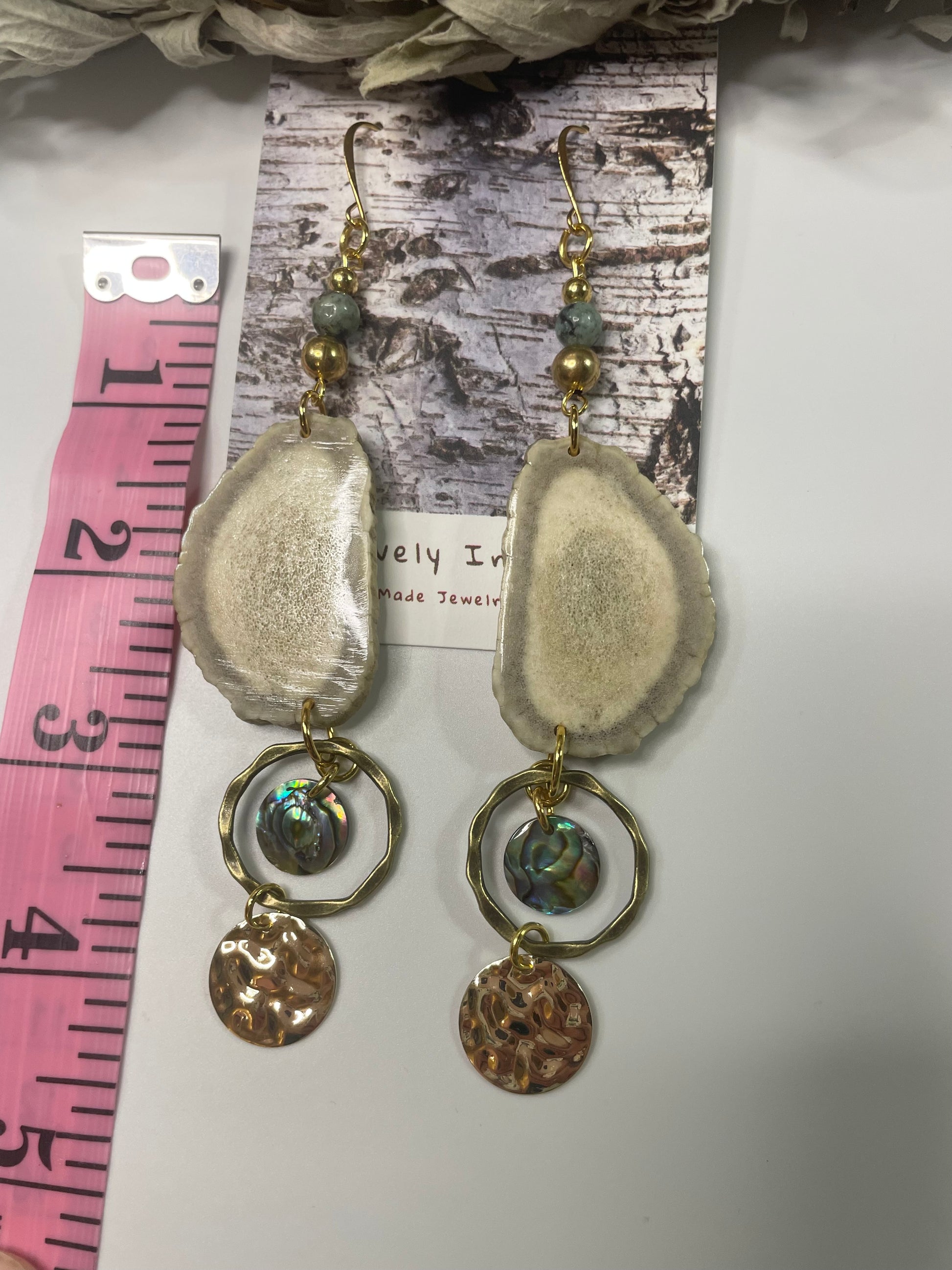 Native American Ojibwe hand made deer antler earrings. Hand cut and polished deer antler hand made by Thomas Ogimaawaajiweb. Abalone. Decorative logo gift packaged.