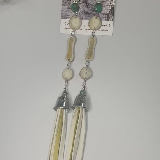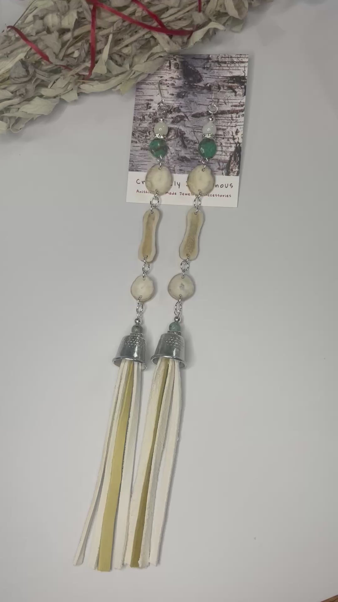 Native American Ojibwe hand made deer antler earrings. Waawaashkeshi deer antler earrings. Extra thin slices for light earring. Hand cut deer antler hand made by Thomas Ogimaawaajiweb. Turquoise and mother of pearl with grandmother thimbles and deer skin. Decorative logo gift packaged.