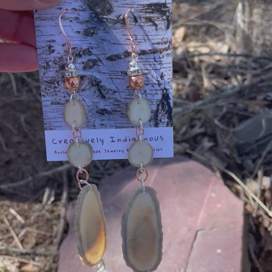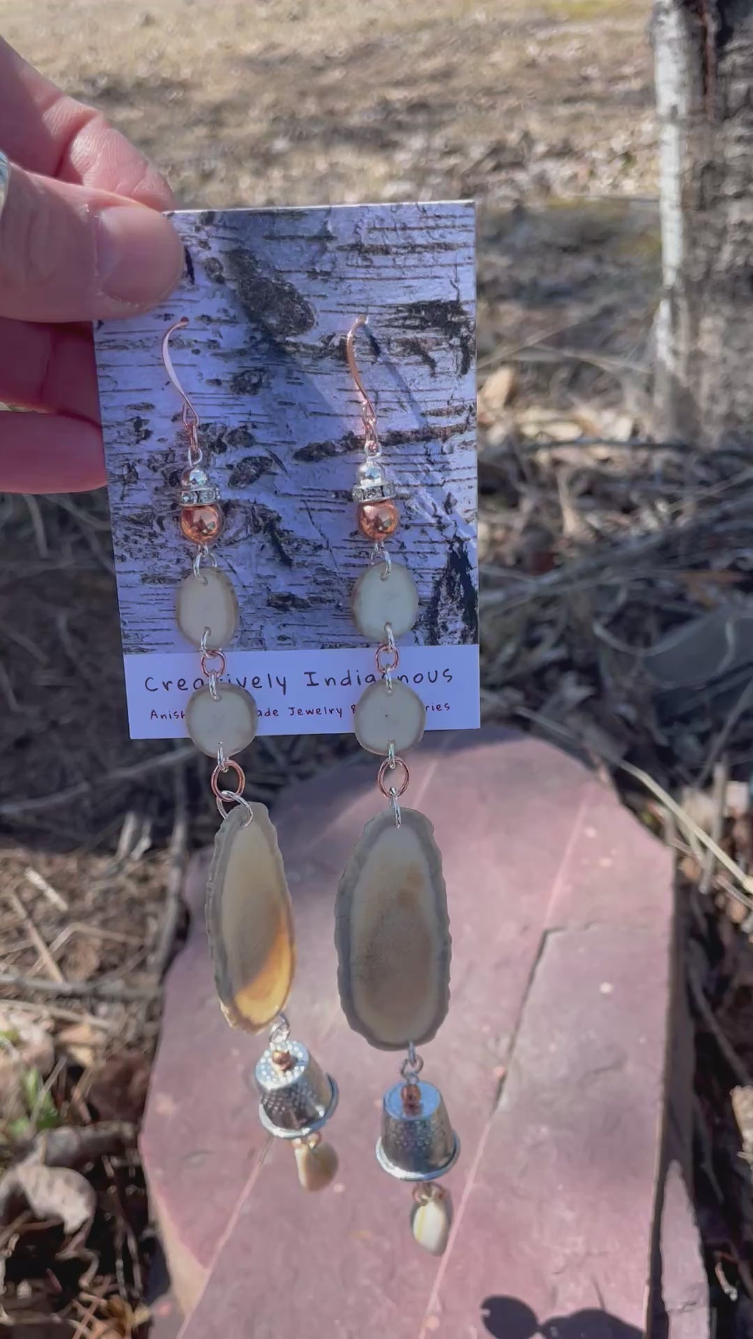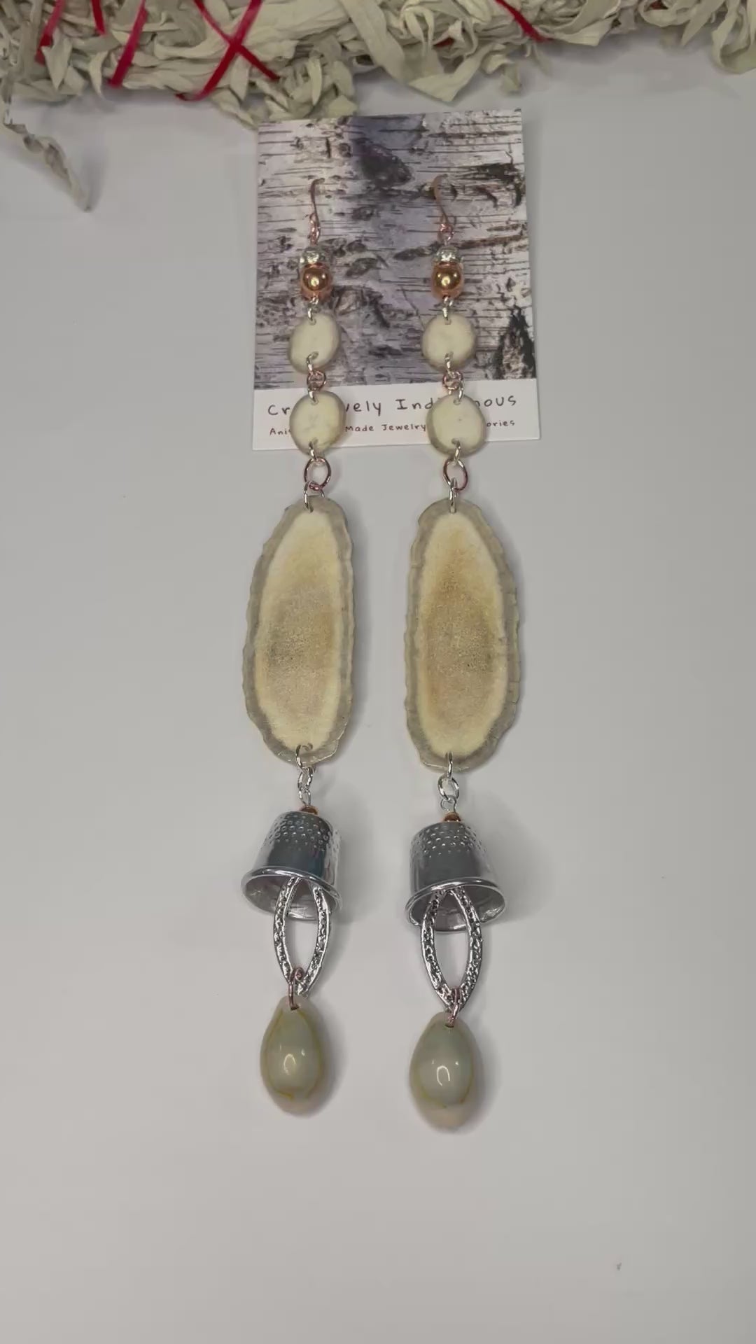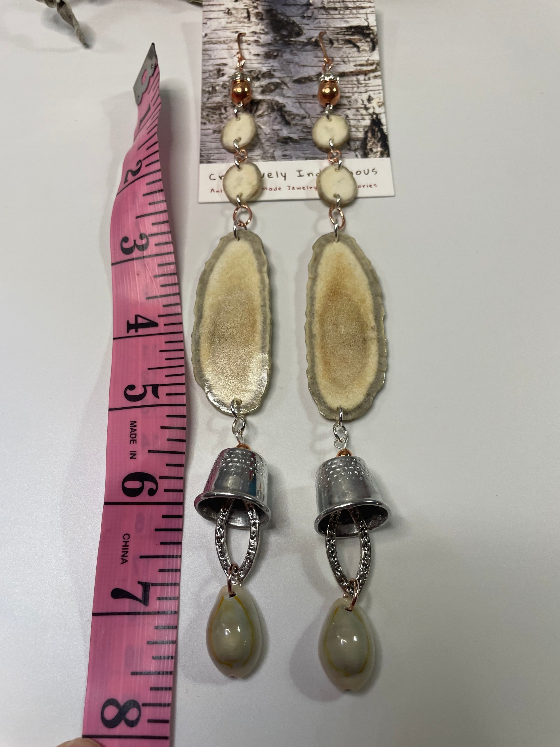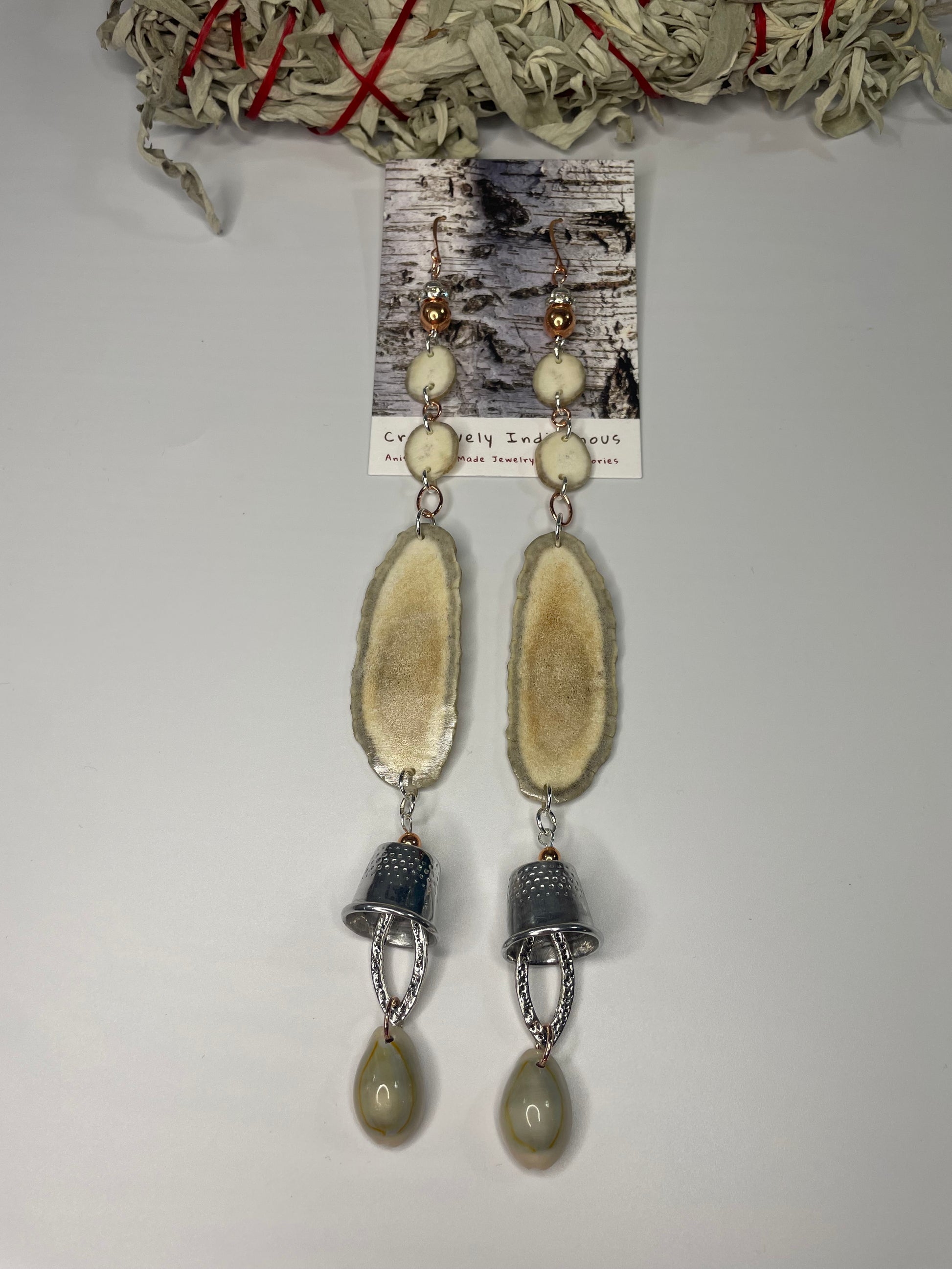 Native American Ojibwe hand made deer antler earrings. Hand cut and polished deer antler hand made by Thomas Ogimaawaajiweb. Cowrie and metal grandmother thimbles. Decorative logo gift packaged.